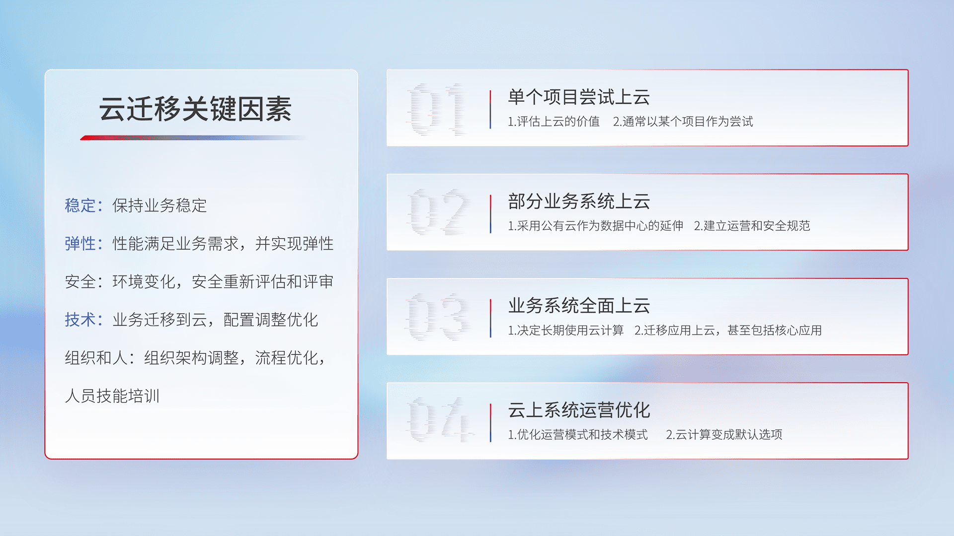 结合实际业务,,从规划设计、、、、云平台选型、、、云原生改造、、、、数据迁移、、、、集成交付,,迁移全过程为客户识别最佳上云路径,,,,做好风险识别管理,,,设计网络架构、、、、身份权限、、、、安全审计合规、、、操作审计、、、日志审计、、、、监控告警策略、、、、多站点容灾设计等,,对云上基础设施进行整体规划,,,提升IT治理水平,,,,以满足弹性、、、高可用、、、、高性能的需求。。。