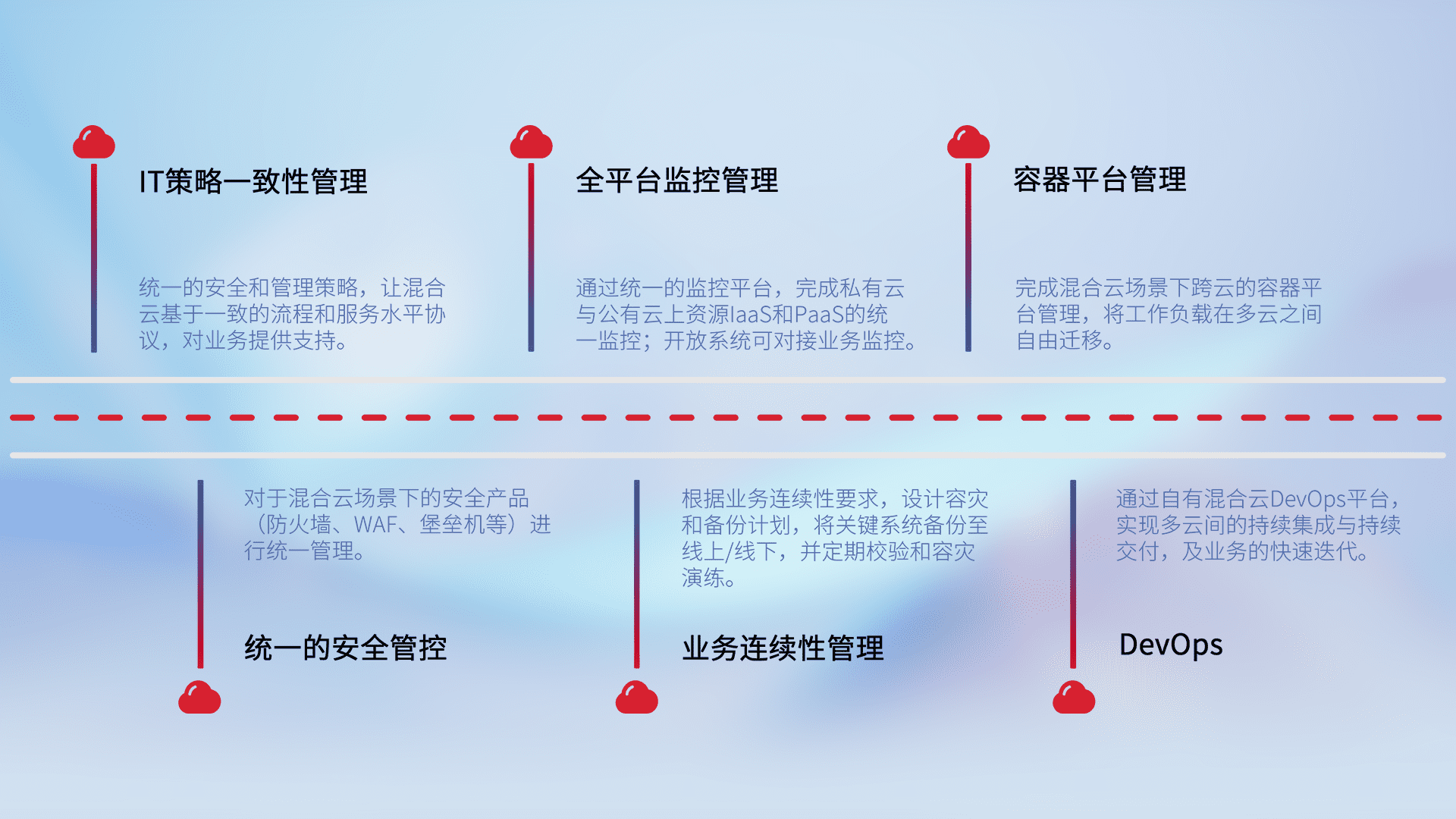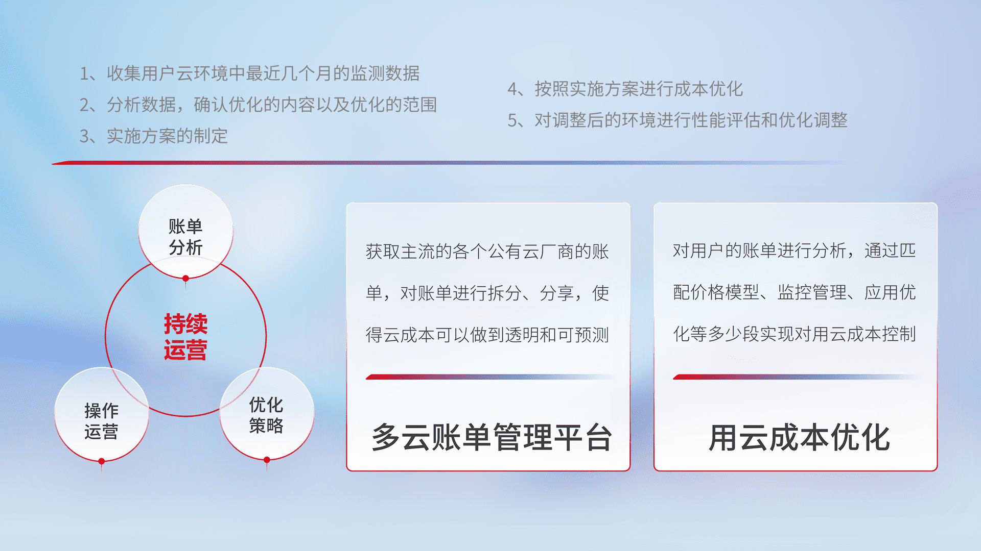 通过多云纳管,,以统一的资源数据模型把客户的云资源进行抽象和封装,,,进而实现对多云资源的统一操作,,,,保障云资源管理的可靠性、、、稳定性与可用性。。量身定制化运维内容,,配置、、开发运维、、补丁管理、、、备份、、、、监控、、认证和访问管理、、、审计和日常巡检等,,,,保障在用云过程中的可靠度,,稳定度以及高可用率。。