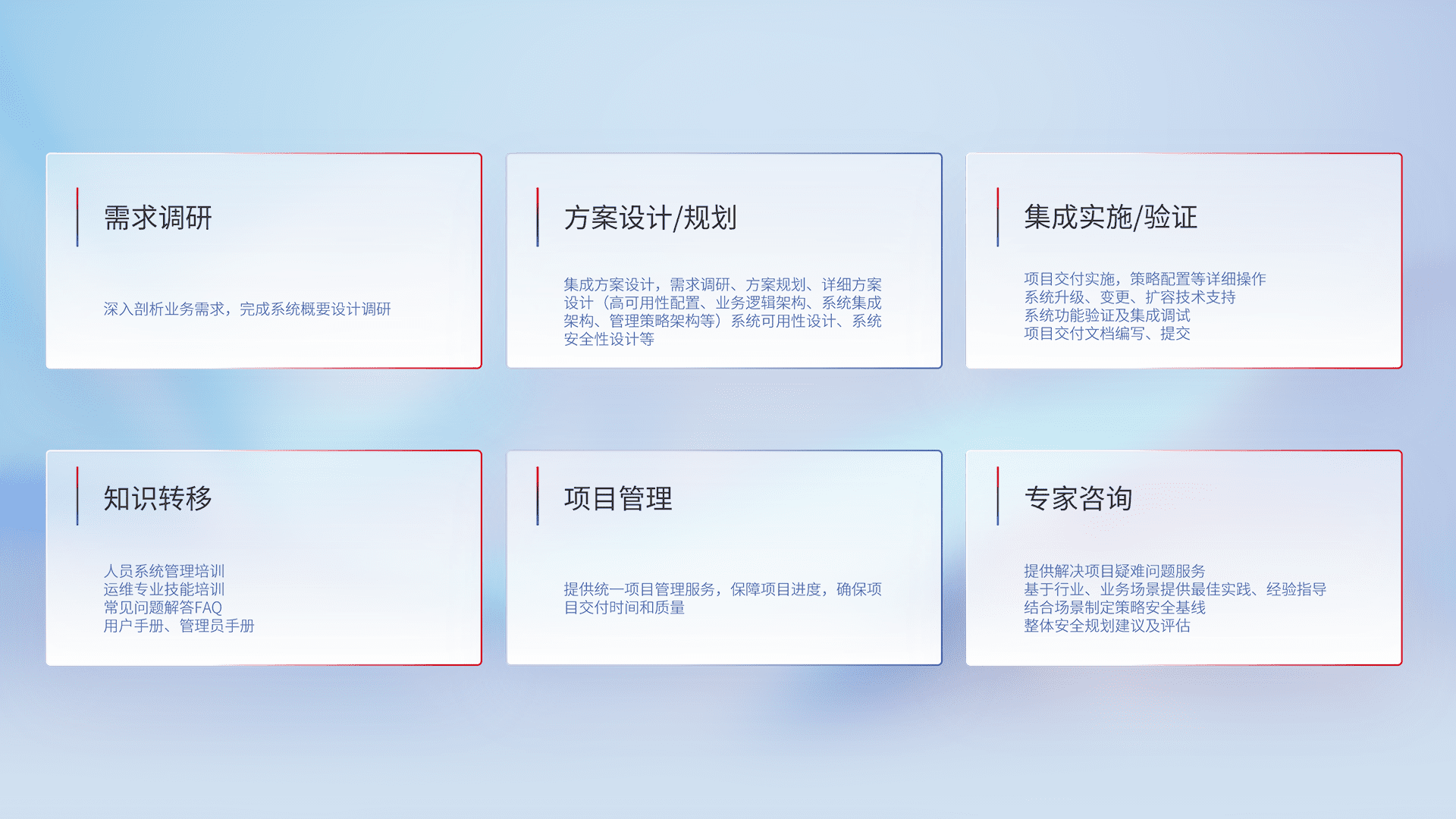 针对客户行业特性,,将宏观的安全战略和需求,,通过专业的交付服务,,,,实现项目落地,,,,为客户提供标准规范的集成交付服务。。。
